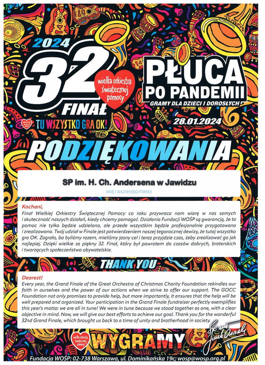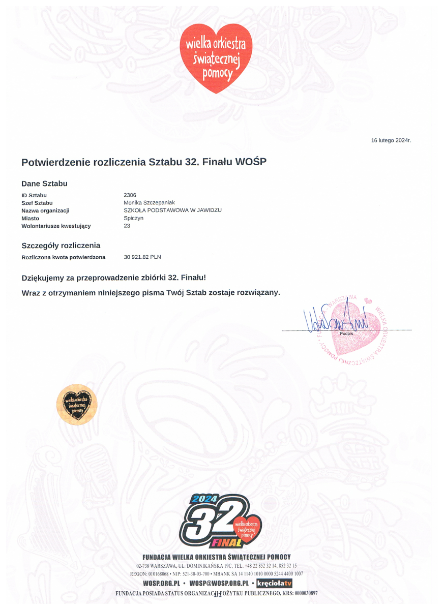 I nasza placówka ma swój wkład w wysokości 1720 zł ze styczniowych działań, tj. loteria fantowa, kiermasz ciasteczkowy, sklepik pluszakowy, zbiórki klasowe. Dziękujemy!