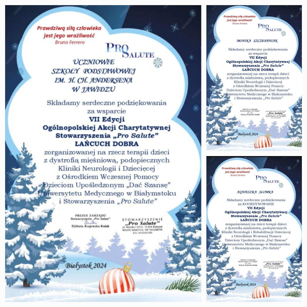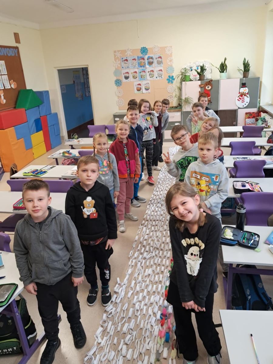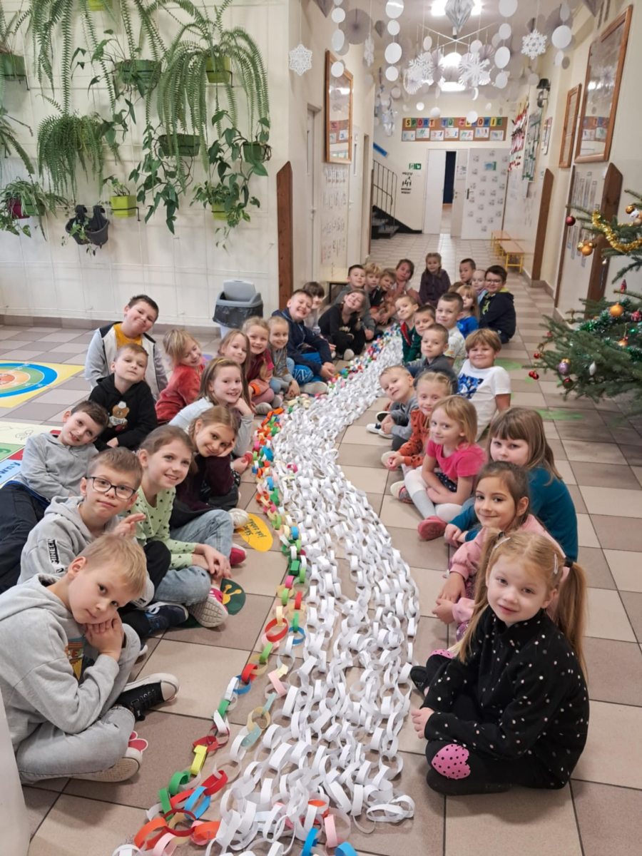Stowarzyszenie Pro Salute wspiera terapię i rehabilitację dzieci niepełnosprawnych, w tym z dystrofią mięśniową. Dzieci z oddziału przedszkolnego i klas 1-3 włączyły się w akcję „Łańcuch Dobra”. Wspólnie wykonali łańcuch choinkowy o długości 91 metrów. Tą symboliczną pracą wsparli podopiecznych Kliniki Neurologii i Rehabilitacji Dziecięcej UMB. W klasach odbyły się pogadanki na ten temat oraz przekazano informację odnośnie możliwości wsparcia finansowego podopiecznych kliniki.