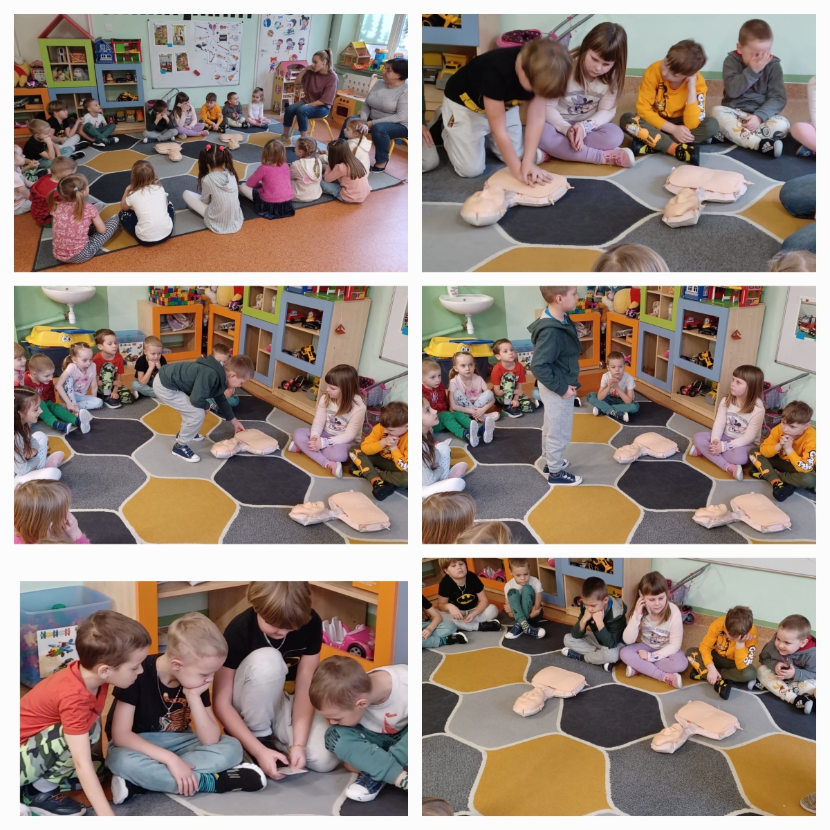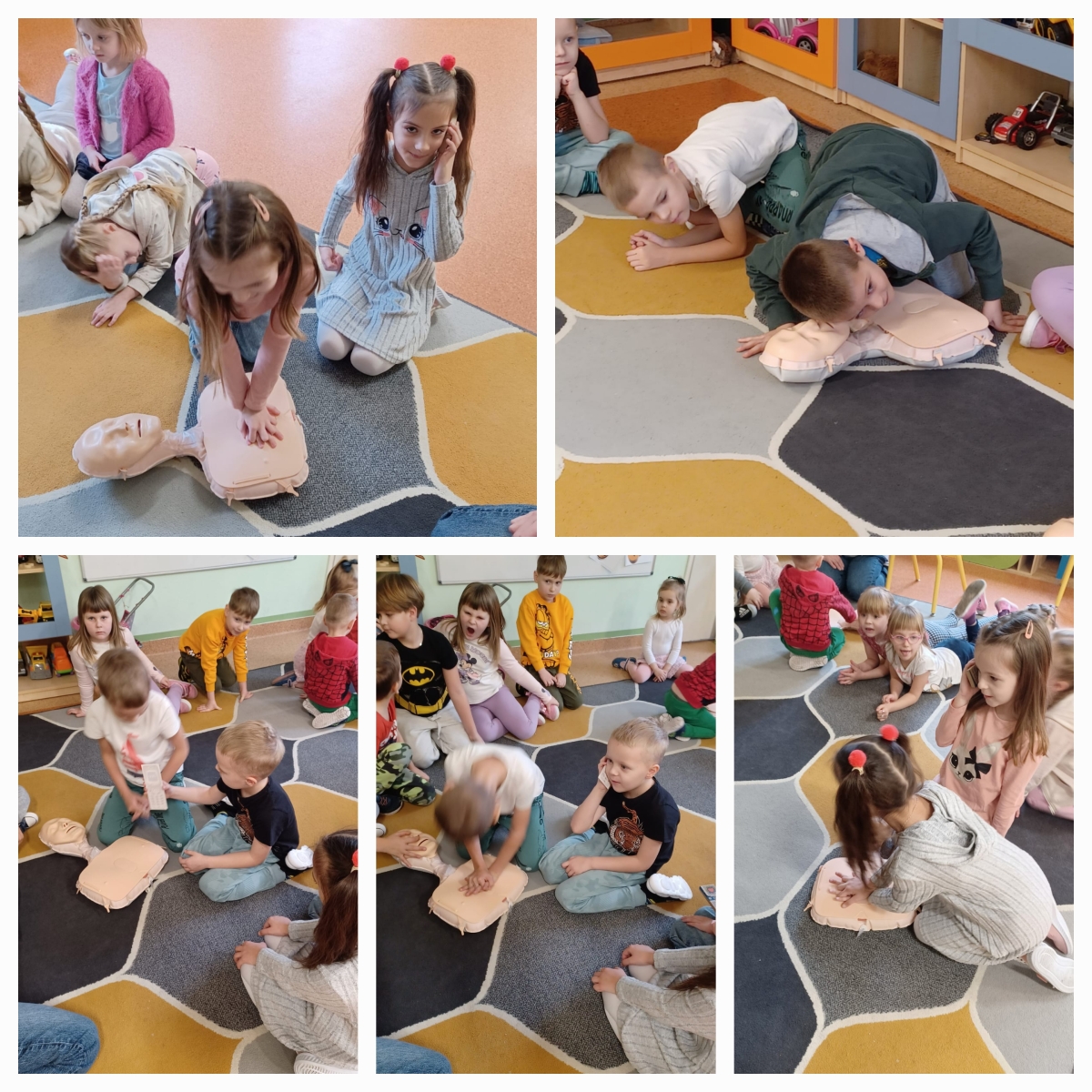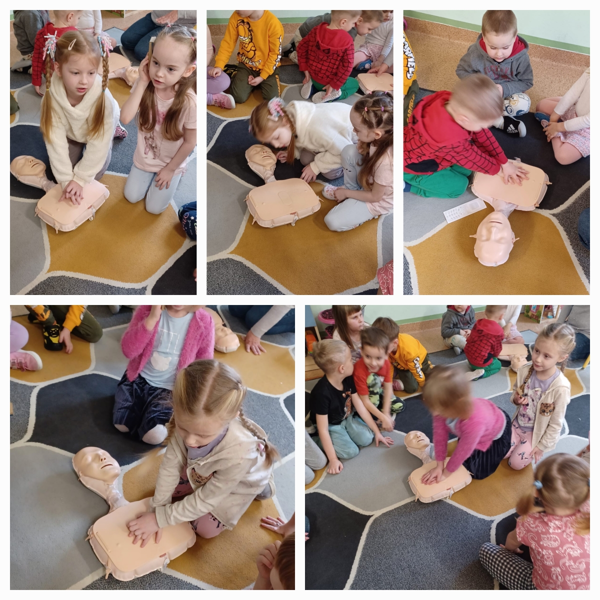Bardzo często w sytuacjach zagrożenia nie wiemy, jak się zachować i jak pomóc osobie, która potrzebuje tej pomocy. Często boimy się lub nie posiadamy wystarczającej wiedzy i umiejętności, aby pomagać. Wiemy jak ważne jest wprowadzanie tematyki pierwszej pomocy i oswajanie z nią najmłodszych. Dzieci często nie posiadają oporów i nie odczuwają strachu, działają instynktownie. Właśnie dlatego już po raz kolejny w przedszkolu odbyły się zajęcia z udzielania pierwszej pomocy przedmedycznej. Dzieci mogły poczuć się jak mali ratownicy. Utrwaliły procedury zachowania się w sytuacjach zagrożenia życia. Wiele emocji wzbudził pokaz czynności z zakresu resuscytacji wykonany na fantomie. Dzieci pod czujnym okiem pań mogły samodzielnie wykazać się praktyczną znajomością udzielania pierwszej pomocy. Zostały zapoznane ze sprzętem ratującym życie. Odgrywały różne scenki sytuacyjne, dla nieprzytomnego i nieoddychającego człowieka (fantoma). Dzieci są pewniejsze siebie, wiedzą, że trzeba pomagać, a w przyszłości nie będą popełniać błędów, do których skłonność mają dorośli. Wiedzą, że wystarczy poszkodowanego położyć w bezpiecznej pozycji i zadbać, by był spokojny. Potem wezwać karetkę i mu o tym powiedzieć. Na tym właśnie polega ostatnie zadanie zajęć z pierwszej pomocy, której uczą się dzieciaki z naszego przedszkola. Mamy nadzieję, że te zajęcia będą wartością na przyszłość.