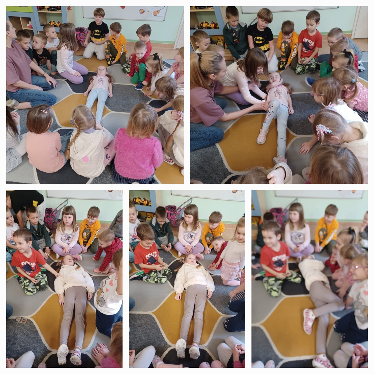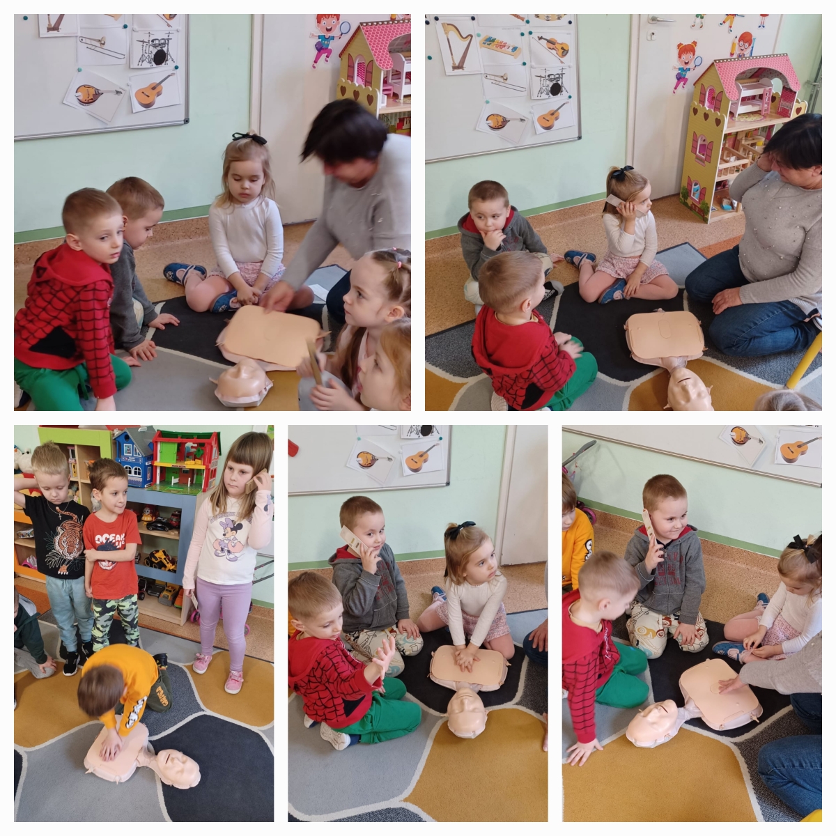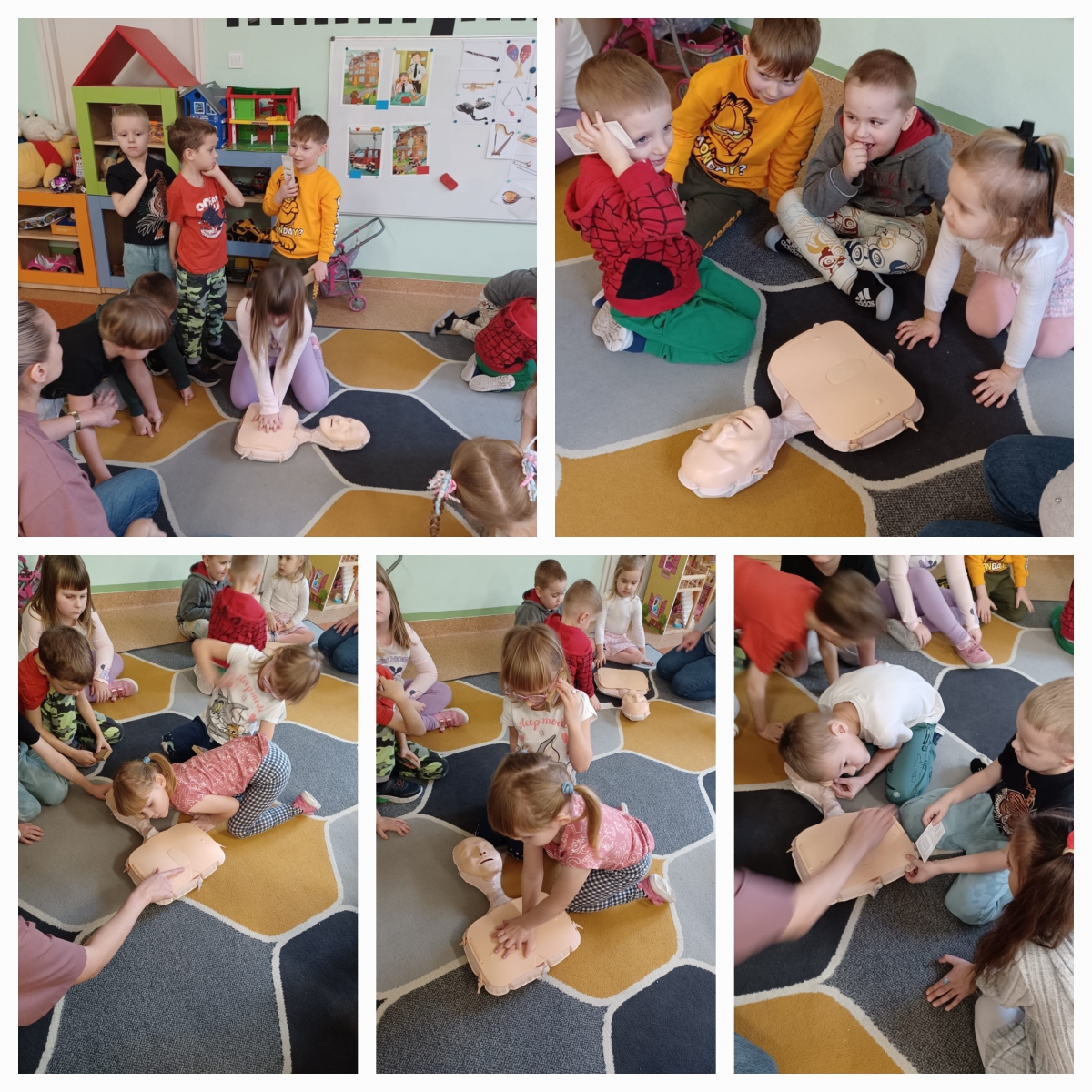Bardzo często w sytuacjach zagrożenia nie wiemy, jak się zachować i jak pomóc osobie, która potrzebuje tej pomocy. Często boimy się lub nie posiadamy wystarczającej wiedzy i umiejętności, aby pomagać. Wiemy jak ważne jest wprowadzanie tematyki pierwszej pomocy i oswajanie z nią najmłodszych. Dzieci często nie posiadają oporów i nie odczuwają strachu, działają instynktownie. Właśnie dlatego już po raz kolejny w przedszkolu odbyły się zajęcia z udzielania pierwszej pomocy przedmedycznej. Dzieci mogły poczuć się jak mali ratownicy. Utrwaliły procedury zachowania się w sytuacjach zagrożenia życia. Wiele emocji wzbudził pokaz czynności z zakresu resuscytacji wykonany na fantomie. Dzieci pod czujnym okiem pań mogły samodzielnie wykazać się praktyczną znajomością udzielania pierwszej pomocy. Zostały zapoznane ze sprzętem ratującym życie. Odgrywały różne scenki sytuacyjne, dla nieprzytomnego i nieoddychającego człowieka (fantoma). Dzieci są pewniejsze siebie, wiedzą, że trzeba pomagać, a w przyszłości nie będą popełniać błędów, do których skłonność mają dorośli. Wiedzą, że wystarczy poszkodowanego położyć w bezpiecznej pozycji i zadbać, by był spokojny. Potem wezwać karetkę i mu o tym powiedzieć. Na tym właśnie polega ostatnie zadanie zajęć z pierwszej pomocy, której uczą się dzieciaki z naszego przedszkola. Mamy nadzieję, że te zajęcia będą wartością na przyszłość.