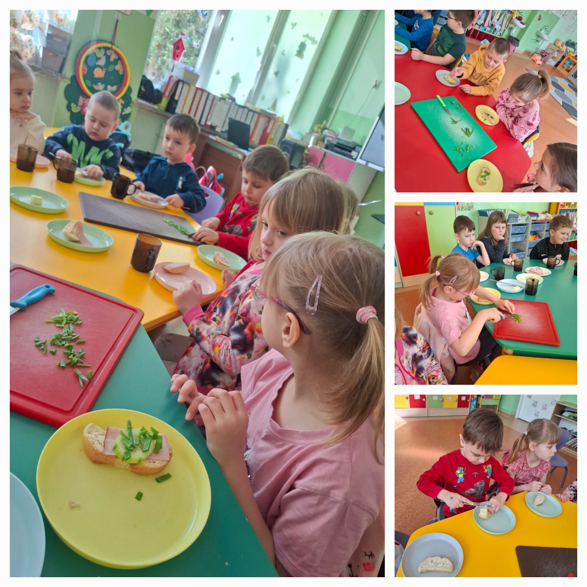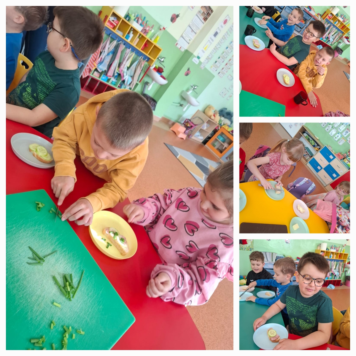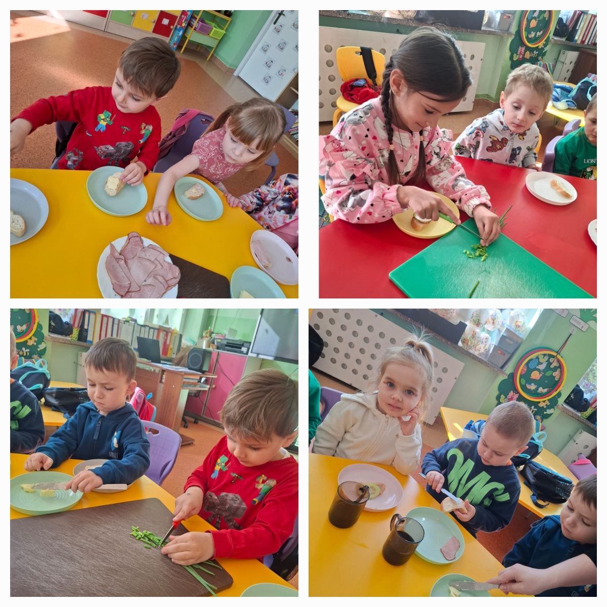 Nasze przedszkolaki przygotowywały zdrowe, kolorowe kanapki. Wszyscy z zaangażowaniem dobierali składniki, aby każda wykonana kanapka wyglądała wyjątkowo. Na stole nie zabrakło wędliny, sera, ogórków, a także samodzielnie wyhodowanego szczypiorku. Głównym celem zajęć było poznanie kolejności działań przygotowania kanapki, kształcenie nawyków odpowiedniego odżywiania oraz rozwijanie kreatywności i doskonalenie samodzielności.