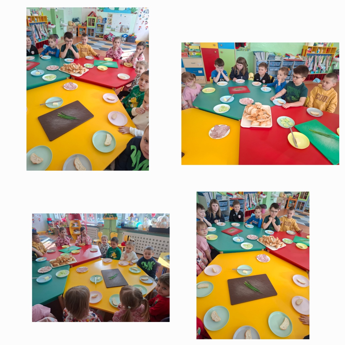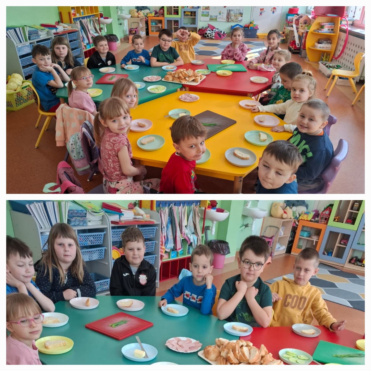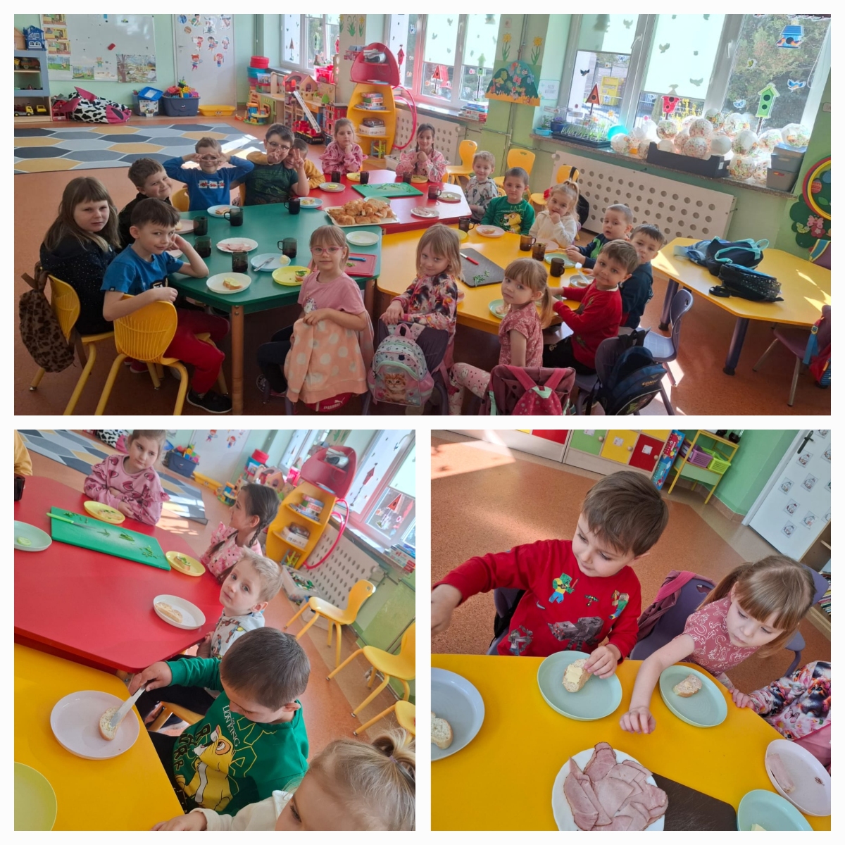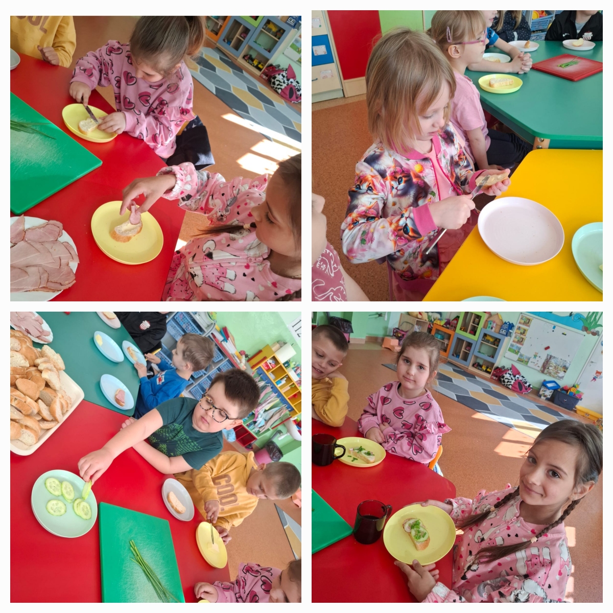Nasze przedszkolaki przygotowywały zdrowe, kolorowe kanapki. Wszyscy z zaangażowaniem dobierali składniki, aby każda wykonana kanapka wyglądała wyjątkowo. Na stole nie zabrakło wędliny, sera, ogórków, a także samodzielnie wyhodowanego szczypiorku. Głównym celem zajęć było poznanie kolejności działań przygotowania kanapki, kształcenie nawyków odpowiedniego odżywiania oraz rozwijanie kreatywności i doskonalenie samodzielności.