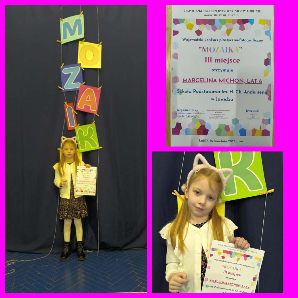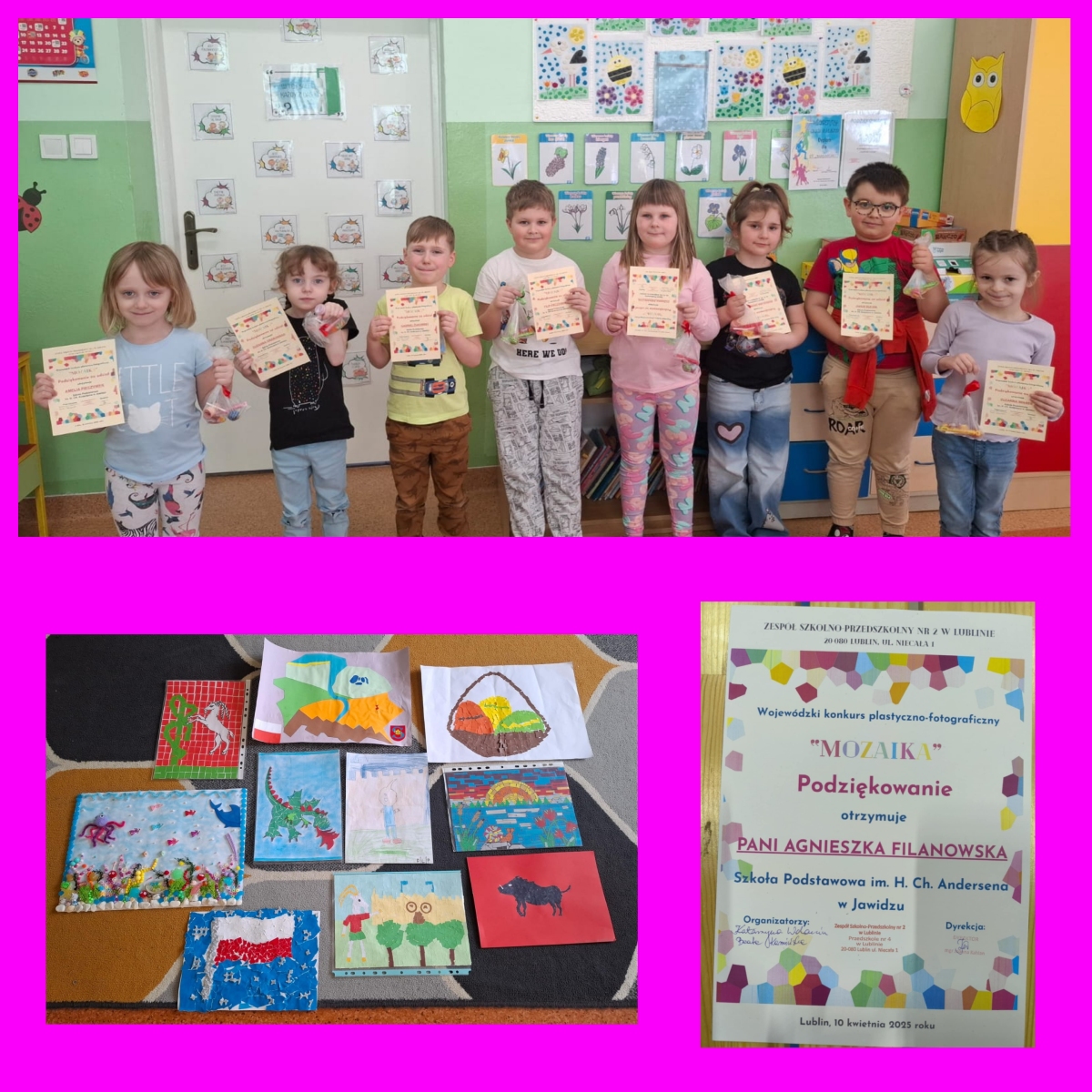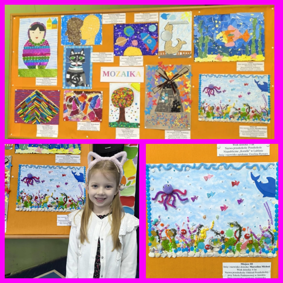 Miło nam poinformować, że Marcelinka z oddziału przedszkolnego zdobyła III miejsce w swojej kategorii wiekowej w Wojewódzkim konkursie plastyczno- fotograficznym „MOZAIKA”. Zadaniem konkursu było wykonanie pracy plastycznej płaskiej lub przestrzennej, złożonej z wielu małych elementów tworzących spójną całość. Gratulujemy! Wszystkim pozostałym Biedroneczkom, uczestnikom tego konkursu, gratulujemy zaangażowania i niesamowitej kreatywności. Brawa dla Was!