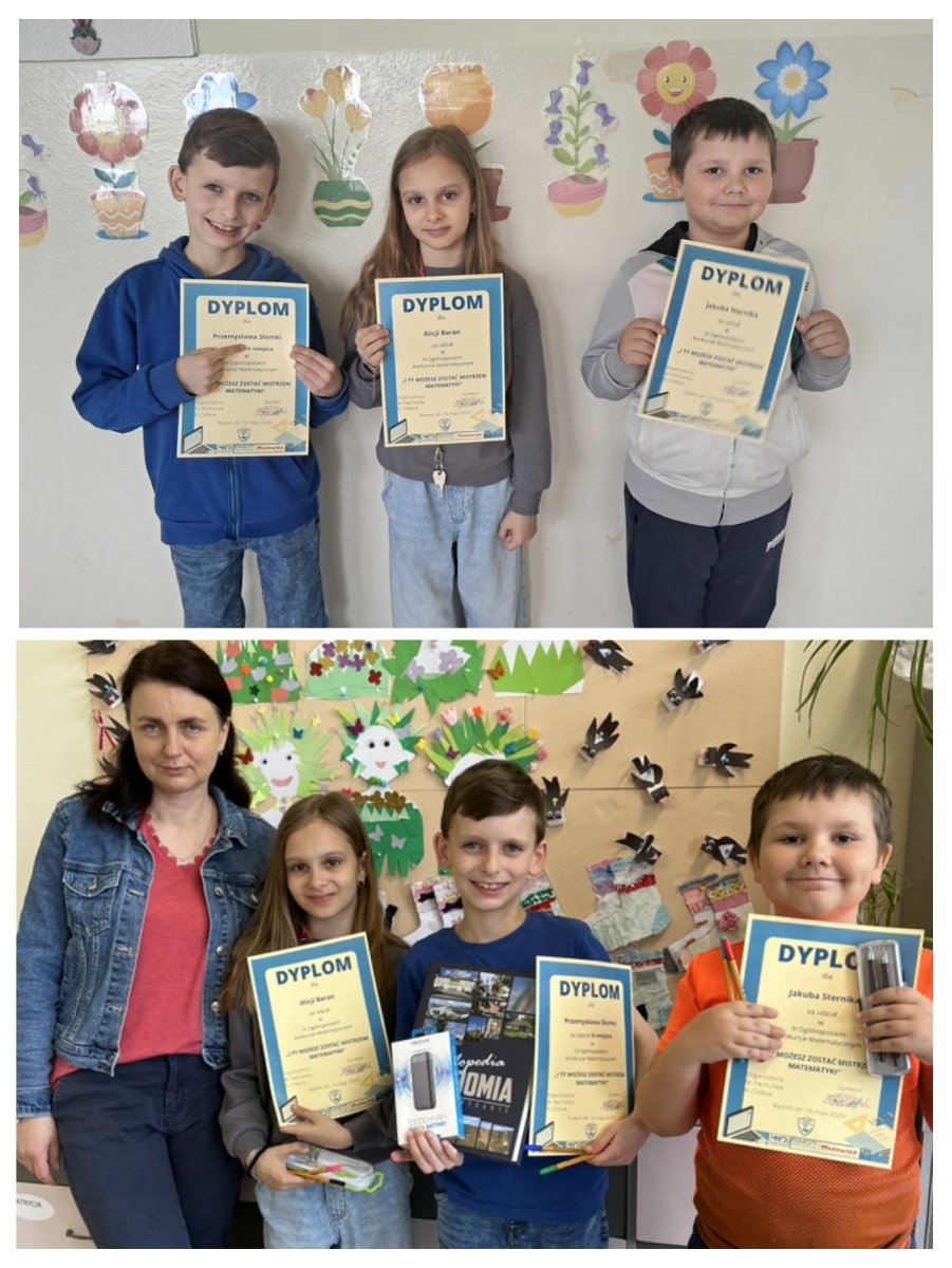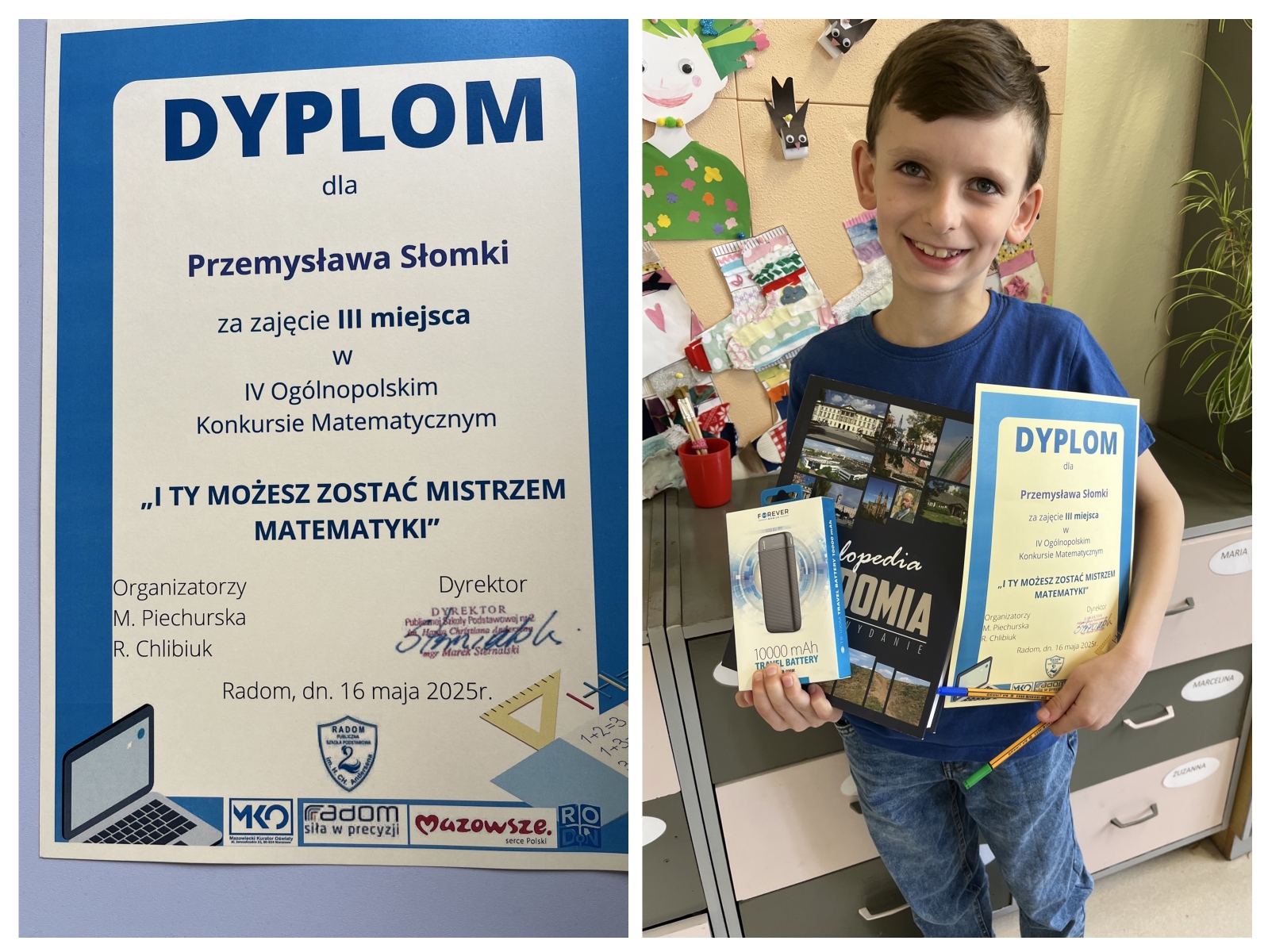 Z radością informujemy, że Przemek zajął III miejsce w ogólnopolskim konkursie matematycznym dla uczniów klas 3 pod nazwą „I Ty możesz zostać mistrzem matematyki”. Konkurs objęty był patronatem honorowym m.in. Marszałka Województwa Mazowieckiego, Prezydenta Miasta Radomia, Mazowieckiego Kuratora Oświaty, Radomskiego Ośrodka Doskonalenia Nauczycieli, a organizowała go Szkoła Podstawowa im. H. Ch. Andersena w Radomiu. Konkurs odbył się 29 kwietnia. Uczestnicy wykazali się umiejętnościami i zdolnościami matematycznymi rozwiązując 15 zadań o różnym stopniu trudności, wykraczającymi poza nową podstawę programową. Konkurs odbył się online w formule Quizizz. Dziękujemy organizatorom za zaproszenie! Naszym uczniom dziękujemy za odwagę i godne reprezentowanie. Laureatowi życzymy dalszych sukcesów w dziedzinie królowej nauk – w MATEMATYCE!