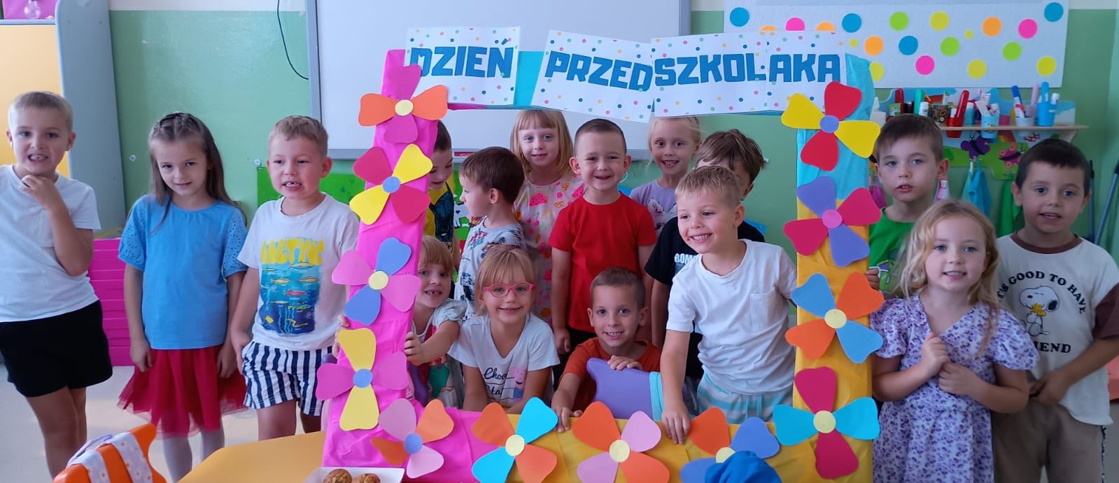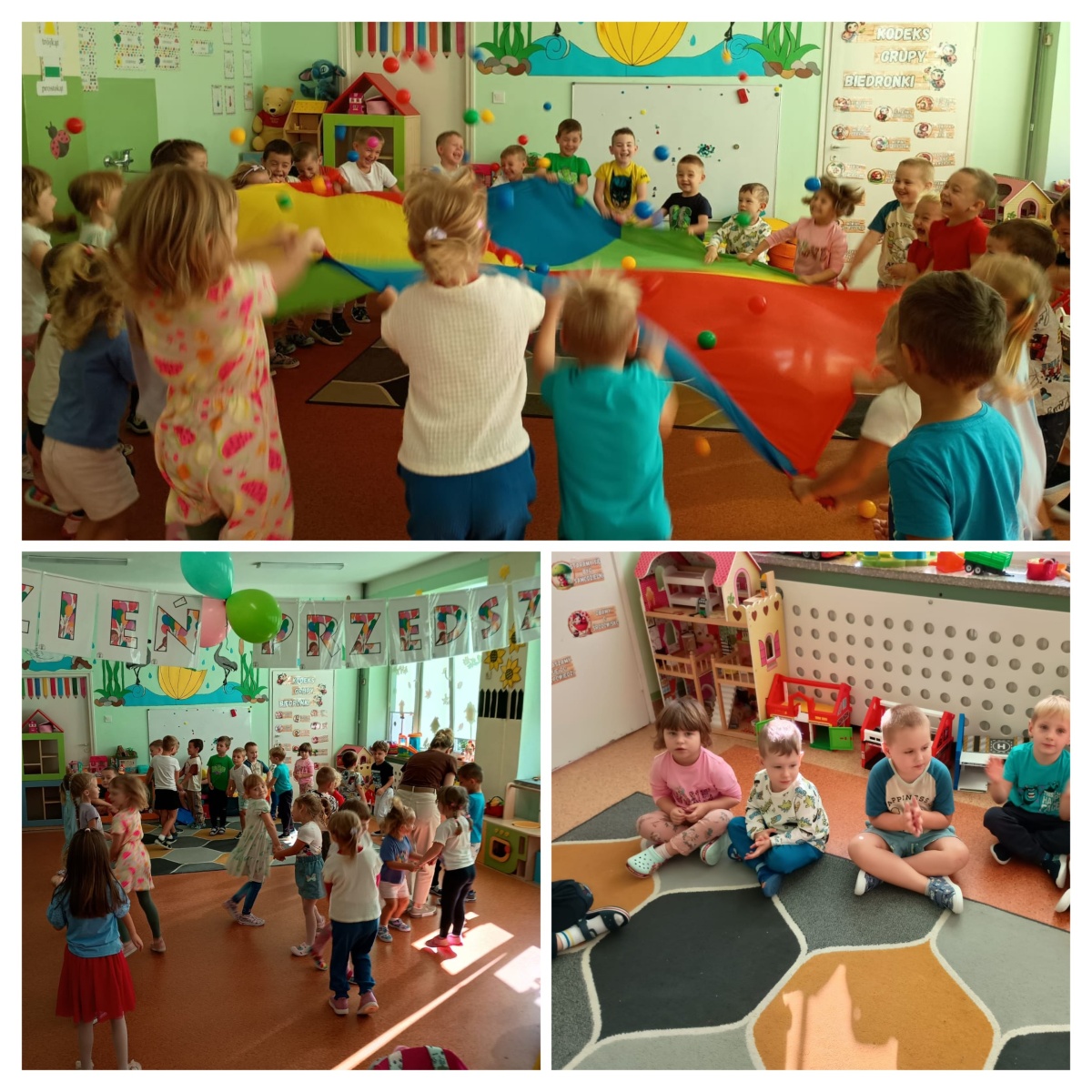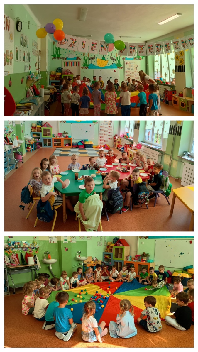 Każdy przedszkolak dobrze wie, że kiedy 20 września zbliża się, od najmłodszego, aż po starszaka wszyscy świętują Dzień Przedszkolaka. Dzień Przedszkolaka to wyjątkowe święto, które pozwala na kreatywne celebrowanie radości i energii, jaką wnoszą przedszkolaki do codziennego życia. Święto przedszkolaków było doskonałą okazją, aby zorganizować wyjątkowe zabawy i aktywności, które sprawiły radość najmłodszym. Dzieci brały udział w zabawach ruchowych- tańczyły i bawiły się chustą animacyjną. Po wspólnych zabawach czekał na dzieci wspólny poczęstunek, który okazał się doskonałą okazją do rozmów i dzielenia się wrażeniami.