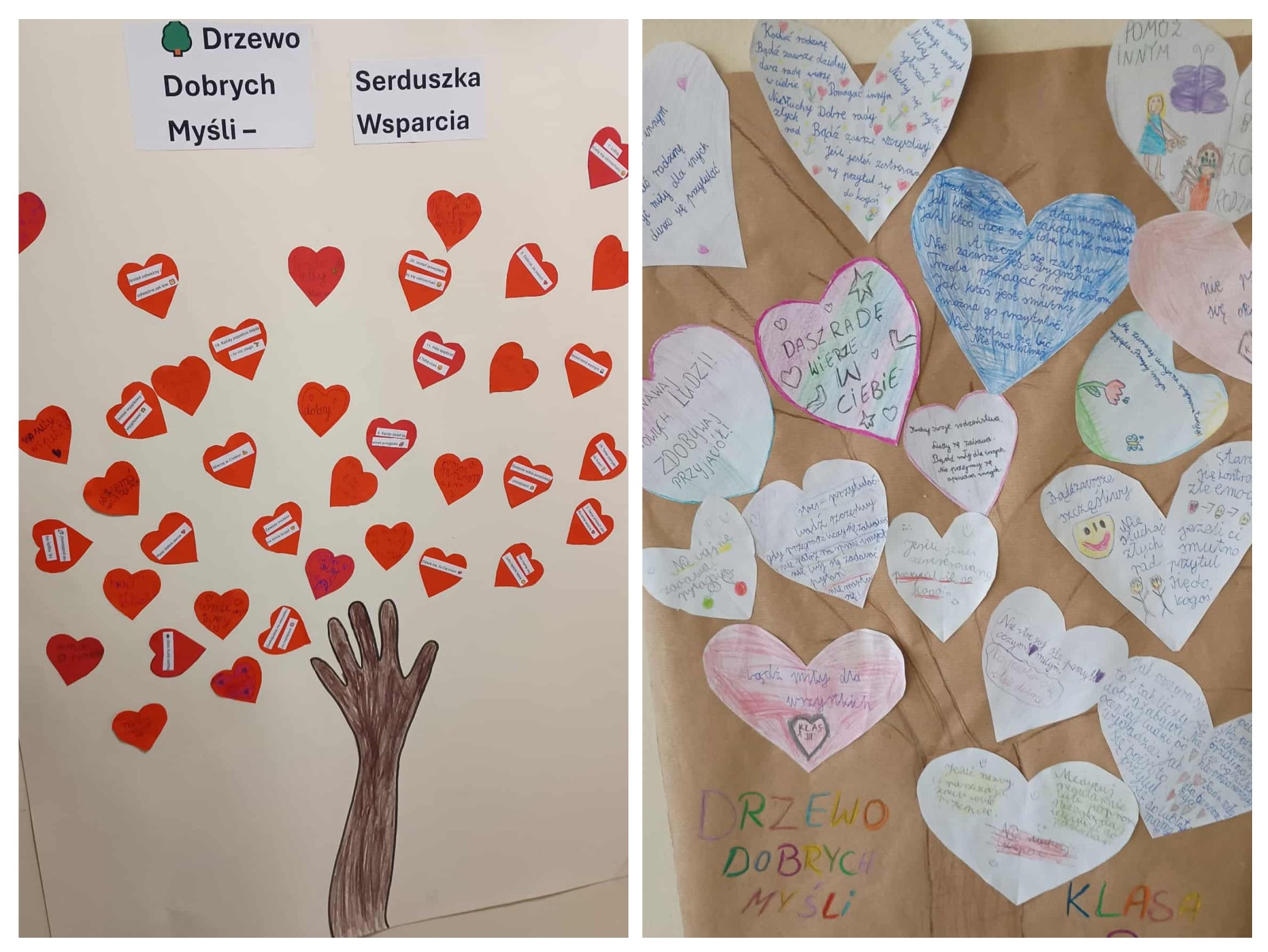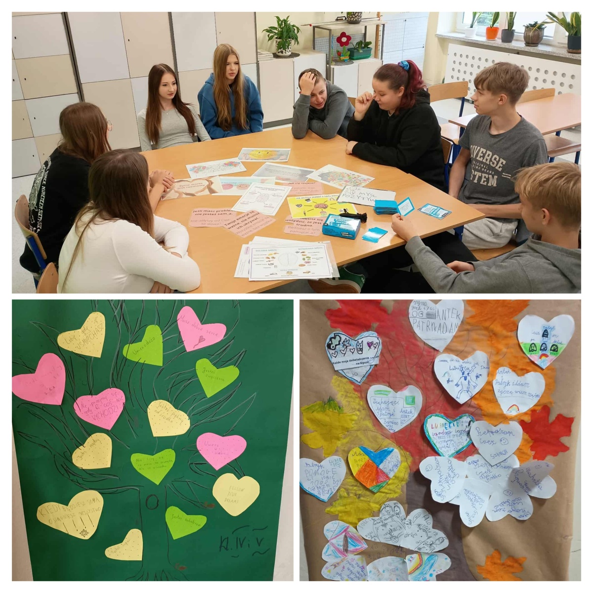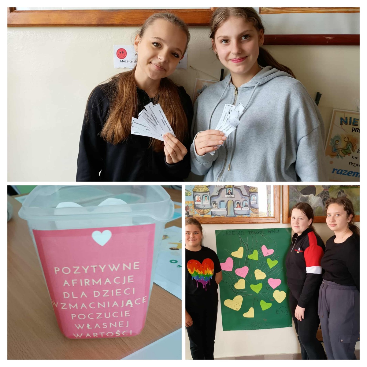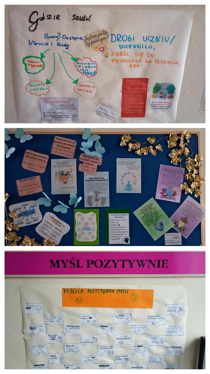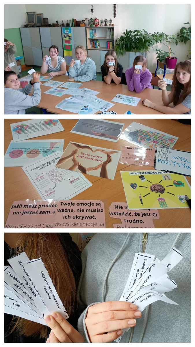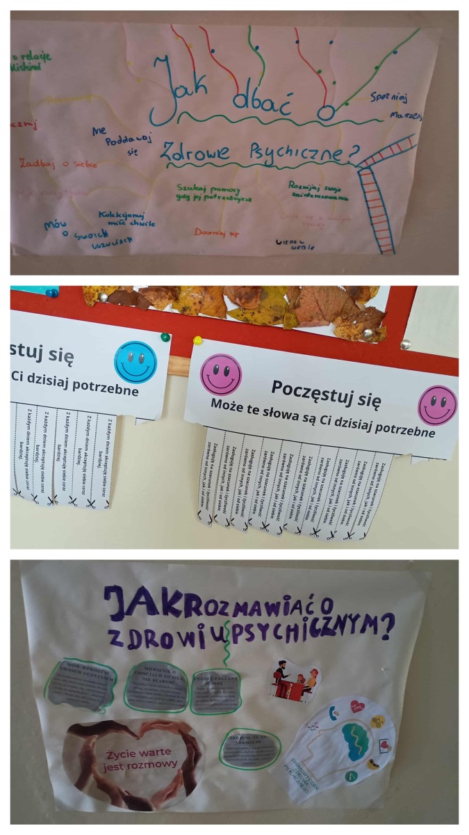 Z inicjatywy psychologa szkolnego w naszej szkole odbył się Tydzień Zdrowia Psychicznego, podczas którego uczniowie klas 1–5 uczestniczyli w specjalnych zajęciach wychowawczych poświęconych emocjom i dbaniu o dobre samopoczucie. Dzieci rozmawiały o tym, co to znaczy być zdrowym psychicznie, uczyły się rozpoznawać emocje, mówić o tym, co czują, a także jak wspierać innych. Podczas zajęć stworzyły „Drzewa dobrych myśli” z serduszkami wsparcia – z miłymi słowami i pozytywnymi hasłami, które trafiły na wspólne klasowe plakaty i zostały wyeksponowane na dolnym korytarzu. Odbyło się również wspólne czytanie bajek terapeutycznych o emocjach, odwadze i pomaganiu innym – uczniowie rozmawiali o przeżyciach bohaterów i sposobach radzenia sobie w trudnych sytuacjach. Dużo radości przyniosła również zabawa w kalambury, podczas której dzieci pokazywały i rozpoznawały różne emocje, ucząc się je lepiej rozumieć. W klasach 6–8 psycholog szkolny przeprowadził warsztaty na temat zdrowia psychicznego. Uczniowie stworzyli plakaty o tym, jak dbać o siebie, jak rozmawiać o emocjach i gdzie szukać pomocy. Powstała także „Tablica pozytywnych myśli”, a na korytarzach zawisły karteczki zrywki z pozytywnymi afirmacjami dla uczniów.