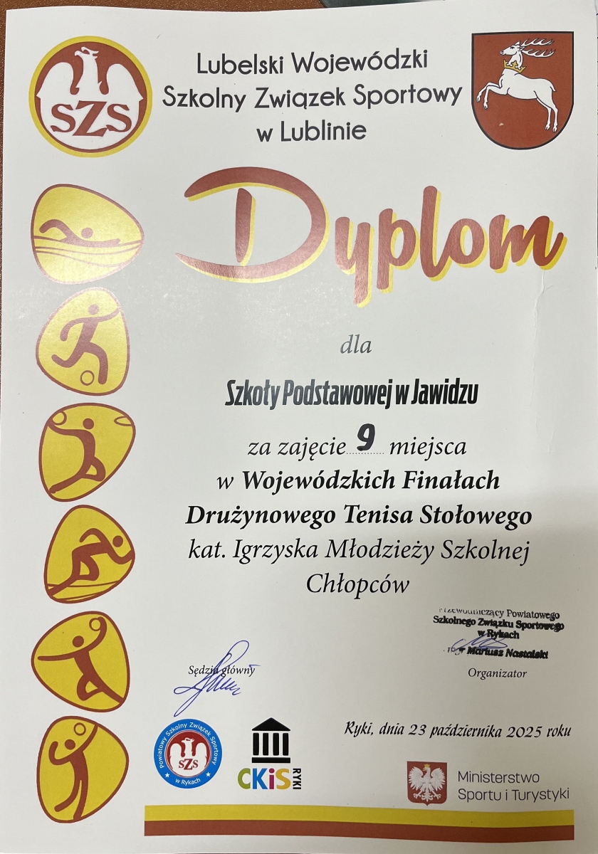 W środę, 22 października, nasi chłopcy uczestniczyli w kolejnym etapie współzawodnictwa w tenisie stołowym – to był już etap wojewódzki ( w Rykach). Zajęli 9. miejsce spośród 12 drużyn z całego województwa. Grali bardzo dobrze, jednak tym razem rywale okazali się lepsi. Nasi reprezentanci dumnie i godnie reprezentowali szkołę, powiat i region. Brawo dla całej drużyny!