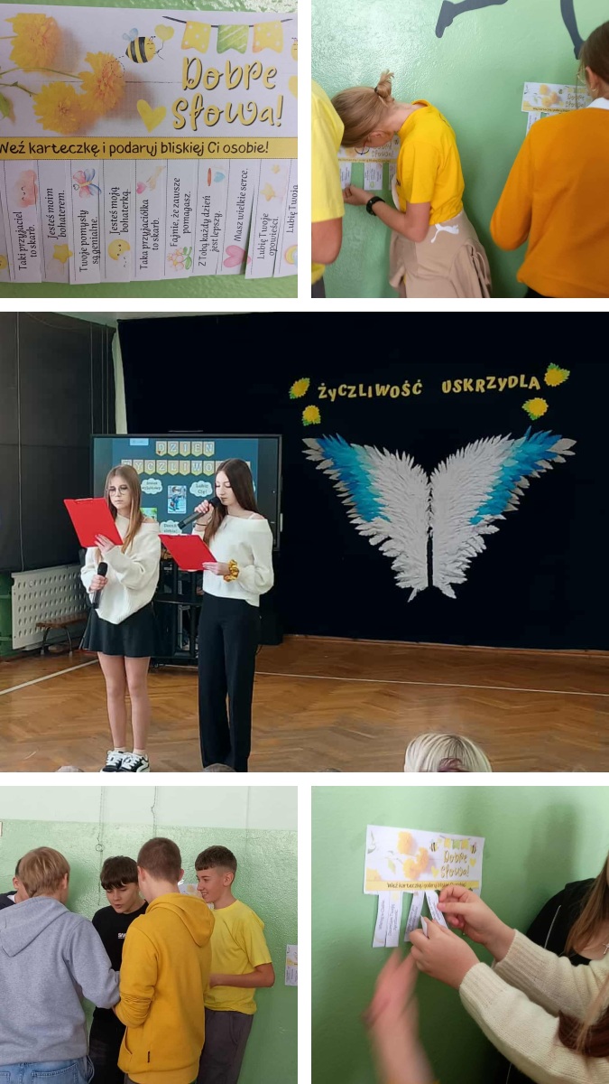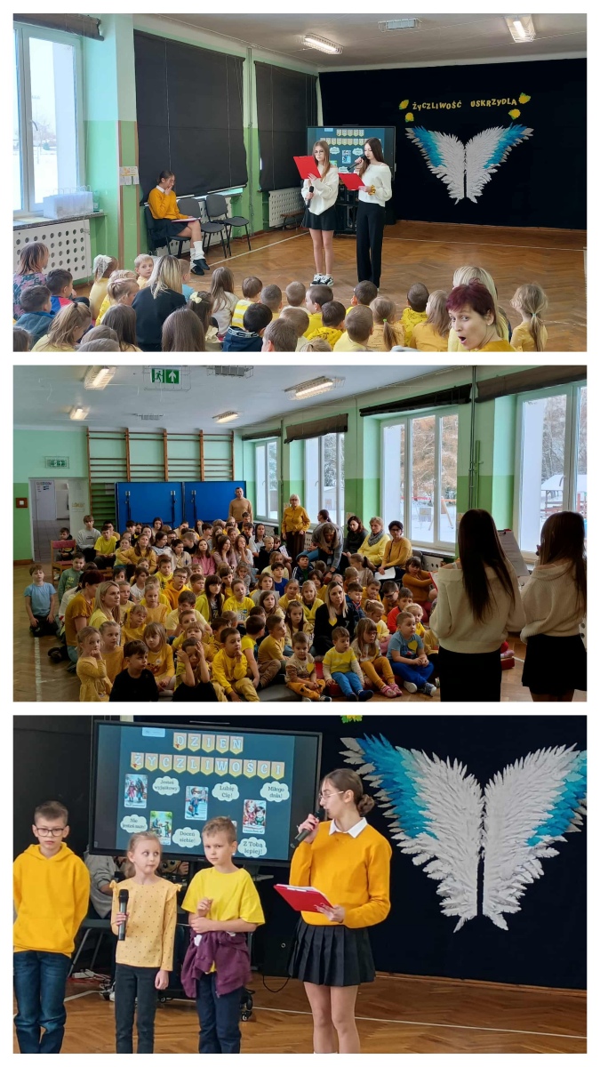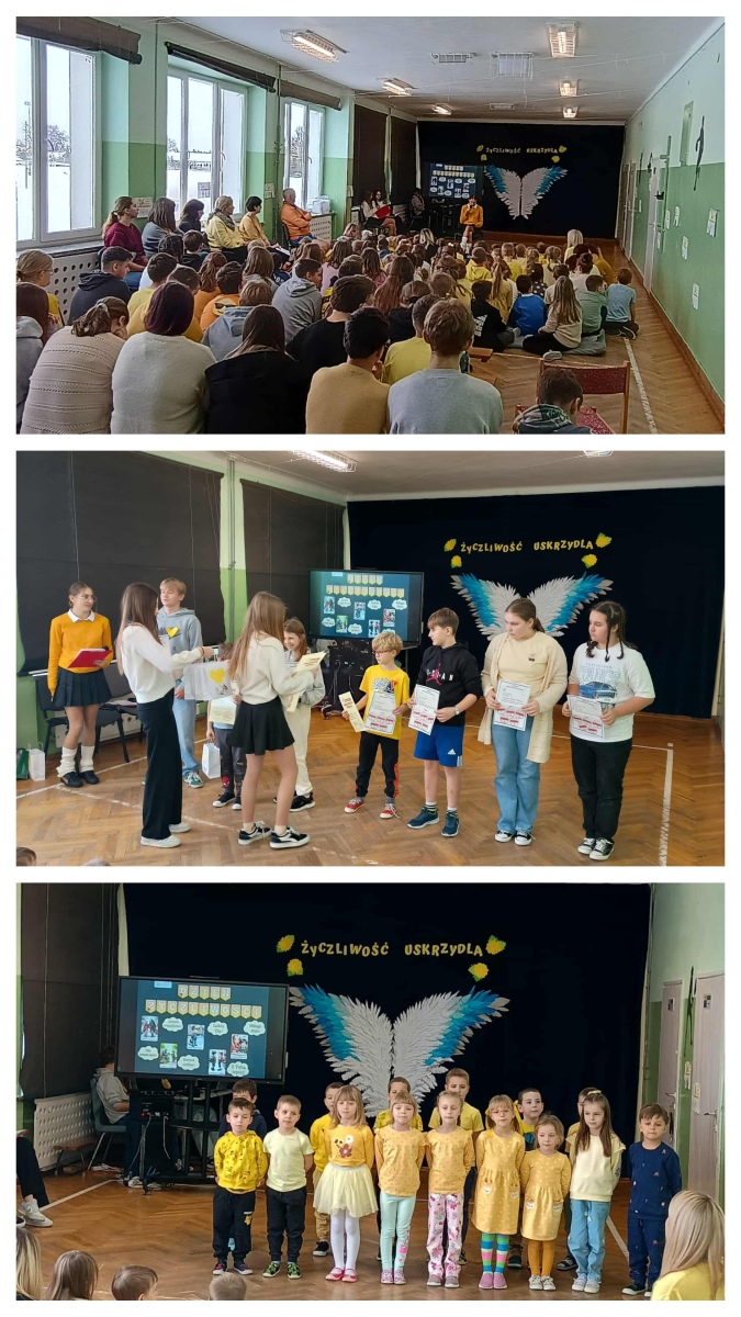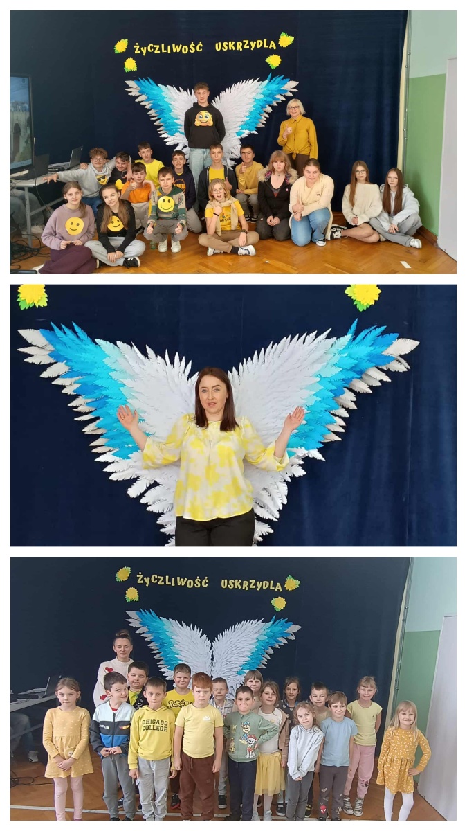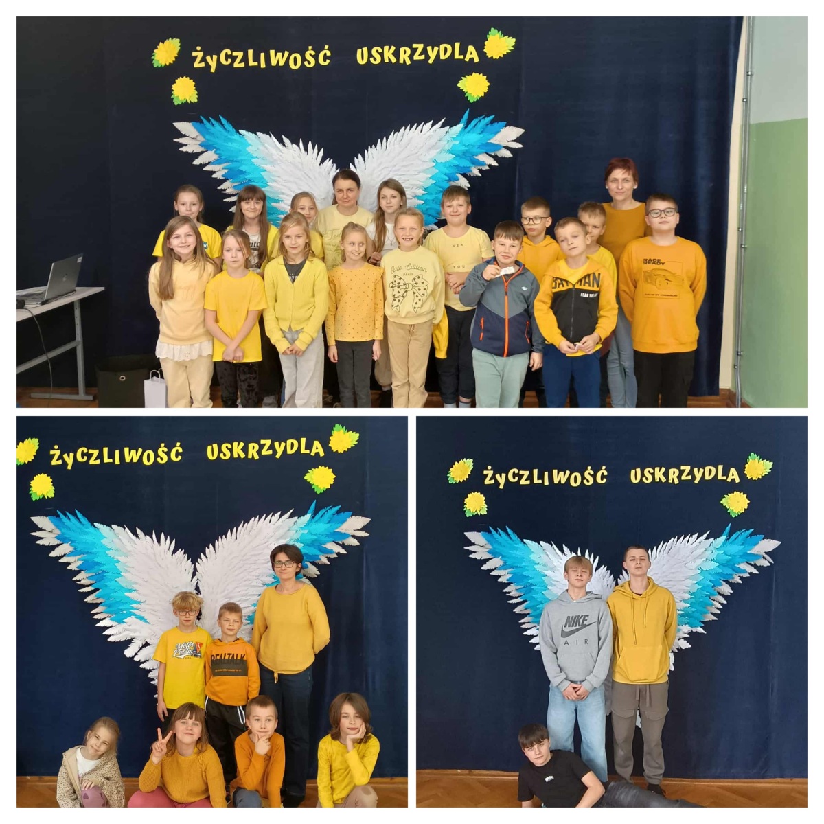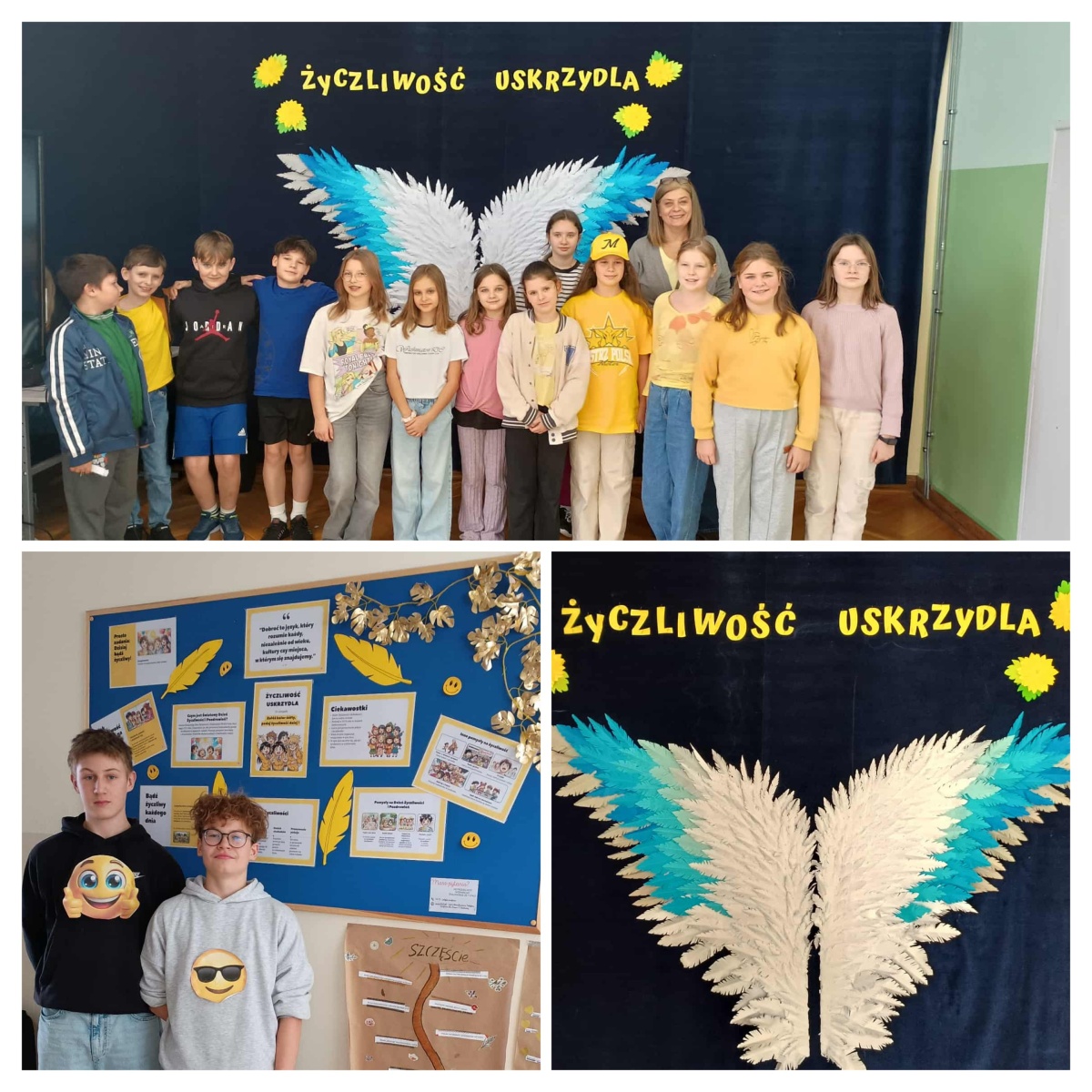 W minionym tygodniu cała społeczność szkolna zaangażowała się w Tydzień Życzliwości, podczas którego uczniowie realizowali różnorodne „misje życzliwości”. Wśród nich znalazły się m.in. „Cichy Przyjaciel”, przygotowywanie plakatów dobrego humoru oraz wiele innych działań mających na celu budowanie miłej atmosfery i wzajemnego wsparcia. Kulminacją tego wyjątkowego tygodnia był szkolny happening, który stał się podsumowaniem wszystkich aktywności. Gościliśmy na nim Panią Życzliwość, która opowiedziała nam o swoich marzeniach, a także udzieliła prawdziwej, lekcji dobroci. Na zakończenie spotkania Pani Życzliwość wręczyła wszystkim miłe upominki w postaci słodkości, nagradzając uczniów za wytrwałość i zaangażowanie w wykonanie wszystkich misji. Następnie przedszkolaki oraz uczniowie klas I–III zaprezentowali swoje występy – piękne piosenki i krótkie inscenizacje o życzliwości, dobrym zachowaniu i wzajemnym szacunku. Uczniowie klas starszych pokazali natomiast krótkie filmiki nagrane w szkole, w których przedstawili, jak w codziennych sytuacjach można okazywać sobie dobro. Była to praktyczna, żywa lekcja życzliwości. Na zakończenie wszyscy podzielili się dobrym słowem, wręczając sobie karteczki z życzliwymi zdaniami. Nie zabrakło również pamiątkowych zdjęć przy „skrzydłach życzliwości”, bo przecież życzliwość naprawdę uskrzydla! To był dzień pełen uśmiechów, inspiracji i pozytywnej energii – mamy nadzieję, że ta atmosfera pozostanie z nami jak najdłużej.