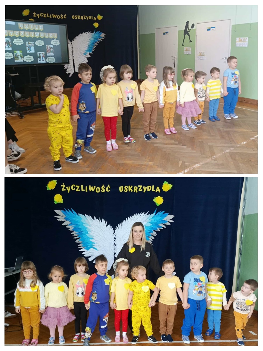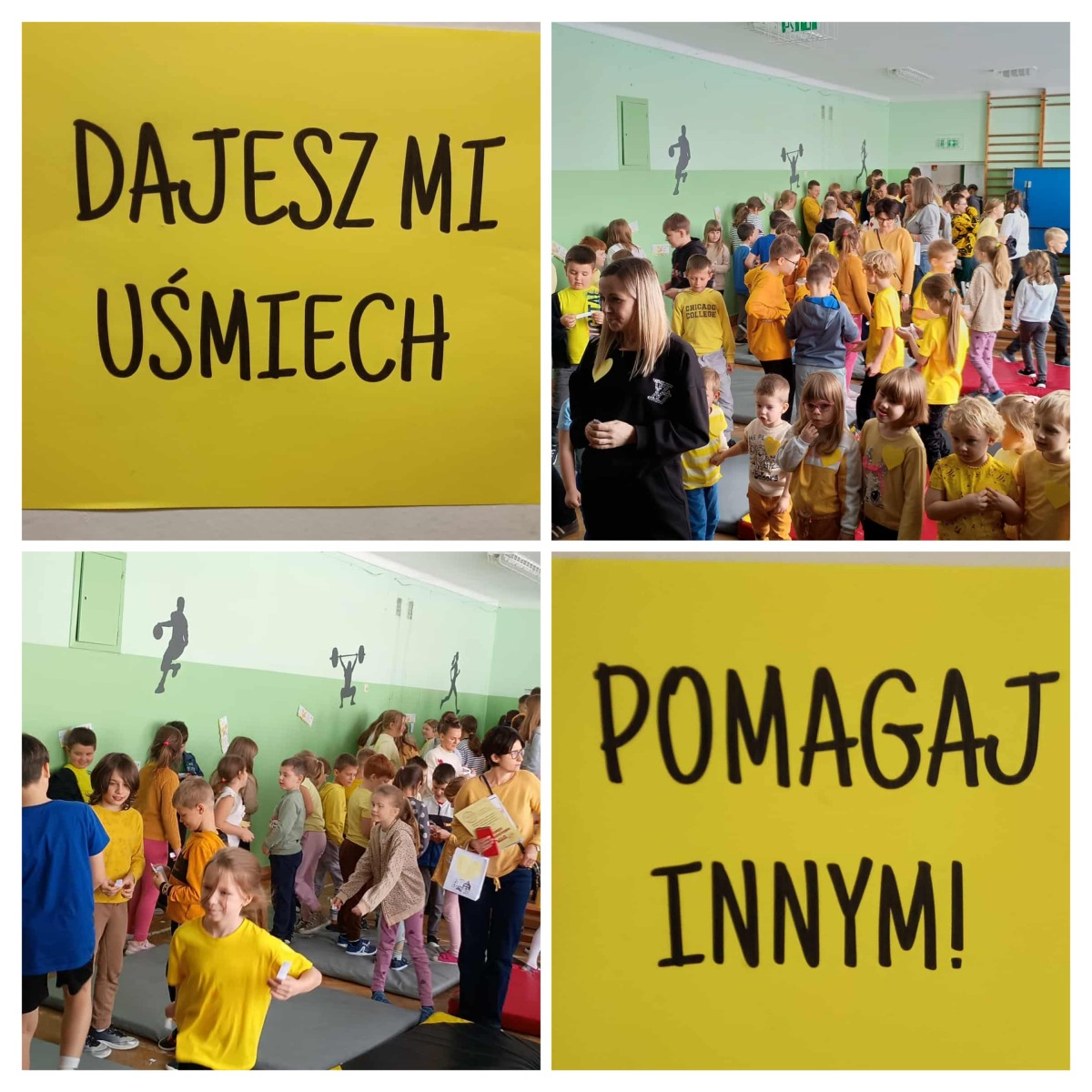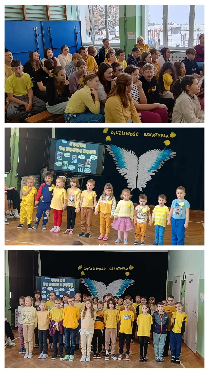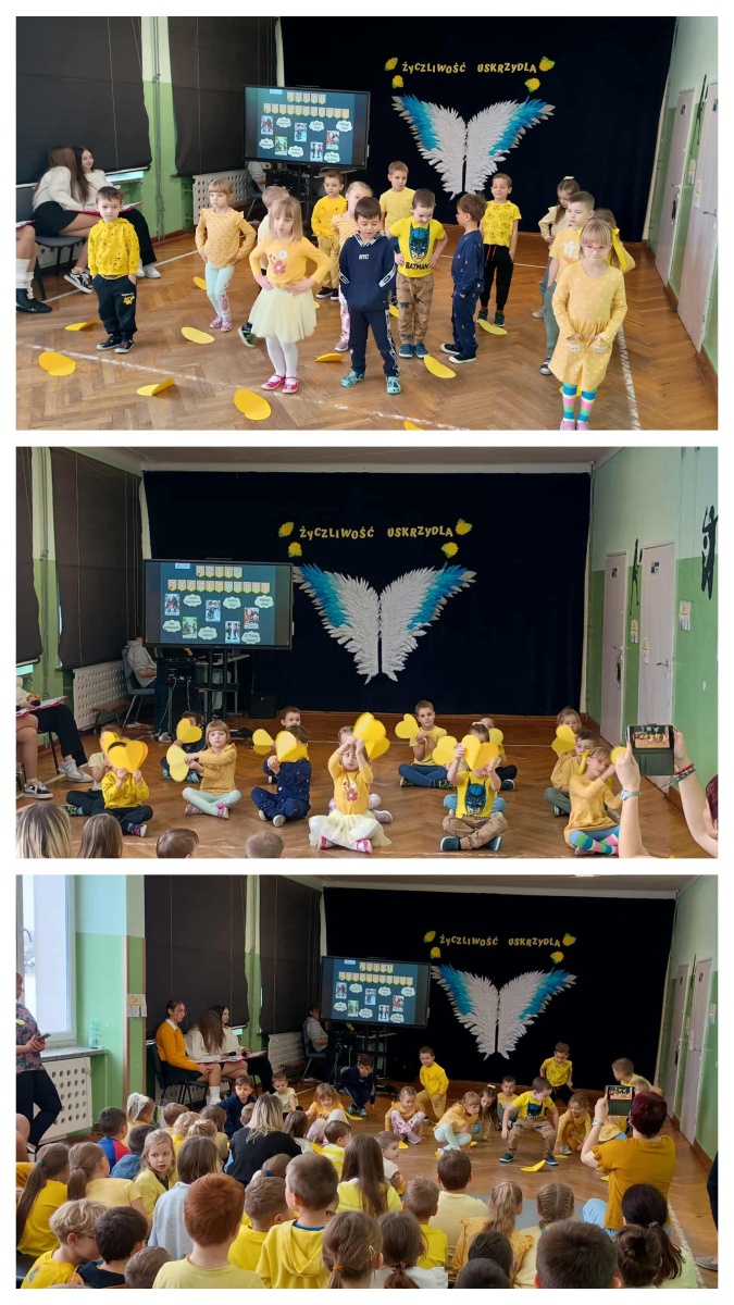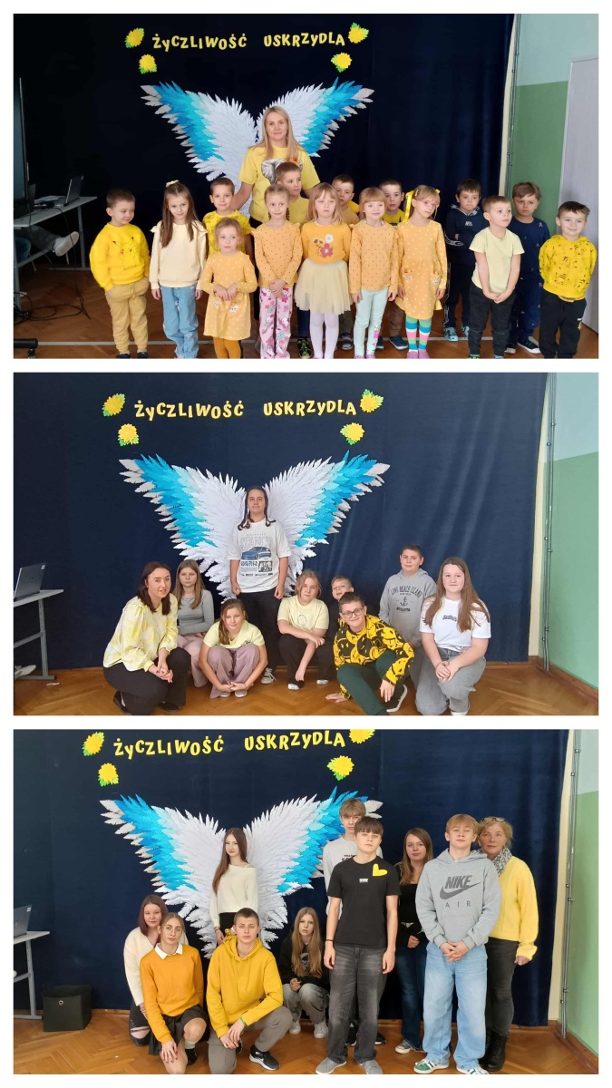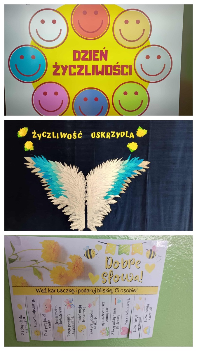 W minionym tygodniu cała społeczność szkolna zaangażowała się w Tydzień Życzliwości, podczas którego uczniowie realizowali różnorodne „misje życzliwości”. Wśród nich znalazły się m.in. „Cichy Przyjaciel”, przygotowywanie plakatów dobrego humoru oraz wiele innych działań mających na celu budowanie miłej atmosfery i wzajemnego wsparcia. Kulminacją tego wyjątkowego tygodnia był szkolny happening, który stał się podsumowaniem wszystkich aktywności. Gościliśmy na nim Panią Życzliwość, która opowiedziała nam o swoich marzeniach, a także udzieliła prawdziwej, lekcji dobroci. Na zakończenie spotkania Pani Życzliwość wręczyła wszystkim miłe upominki w postaci słodkości, nagradzając uczniów za wytrwałość i zaangażowanie w wykonanie wszystkich misji. Następnie przedszkolaki oraz uczniowie klas I–III zaprezentowali swoje występy – piękne piosenki i krótkie inscenizacje o życzliwości, dobrym zachowaniu i wzajemnym szacunku. Uczniowie klas starszych pokazali natomiast krótkie filmiki nagrane w szkole, w których przedstawili, jak w codziennych sytuacjach można okazywać sobie dobro. Była to praktyczna, żywa lekcja życzliwości. Na zakończenie wszyscy podzielili się dobrym słowem, wręczając sobie karteczki z życzliwymi zdaniami. Nie zabrakło również pamiątkowych zdjęć przy „skrzydłach życzliwości”, bo przecież życzliwość naprawdę uskrzydla! To był dzień pełen uśmiechów, inspiracji i pozytywnej energii – mamy nadzieję, że ta atmosfera pozostanie z nami jak najdłużej.