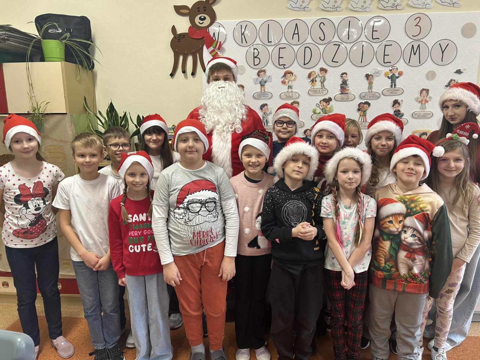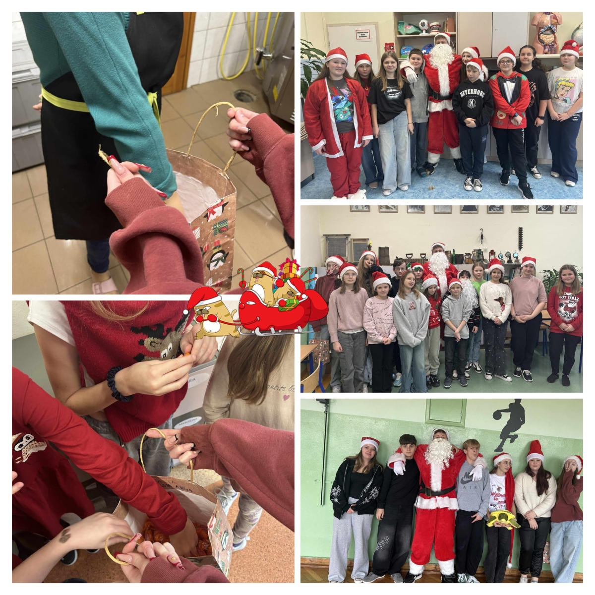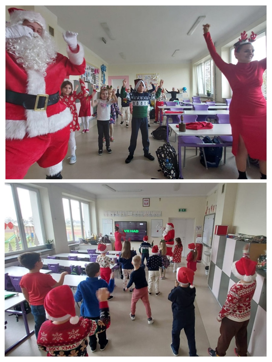 W piątek szkolne korytarze zamieniły się w prawdziwe mikołajowe miasteczko. Za sprawą Samorządu Uczniowskiego odbył się „Zjazd Świętych Mikołajów”, podczas którego uczniowie masowo porzucili zwykłe, szkolne ubrania (i powagę) na rzecz czerwonych czapek, brodatych stylizacji i sweterków tak świątecznych, że nawet renifery patrzyły z zazdrością. Każdy uczeń otrzymał słodki upominek – w końcu prawdziwy Mikołaj nie wychodzi z domu bez prezentów! Atmosfera była tak radosna, że nawet dzwoneczki dźwięczały głośniej niż zwykle.