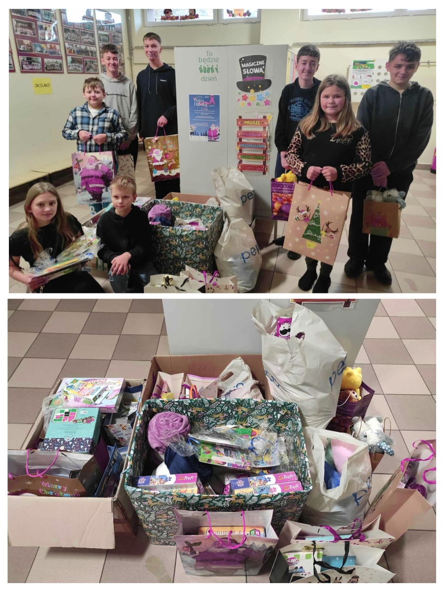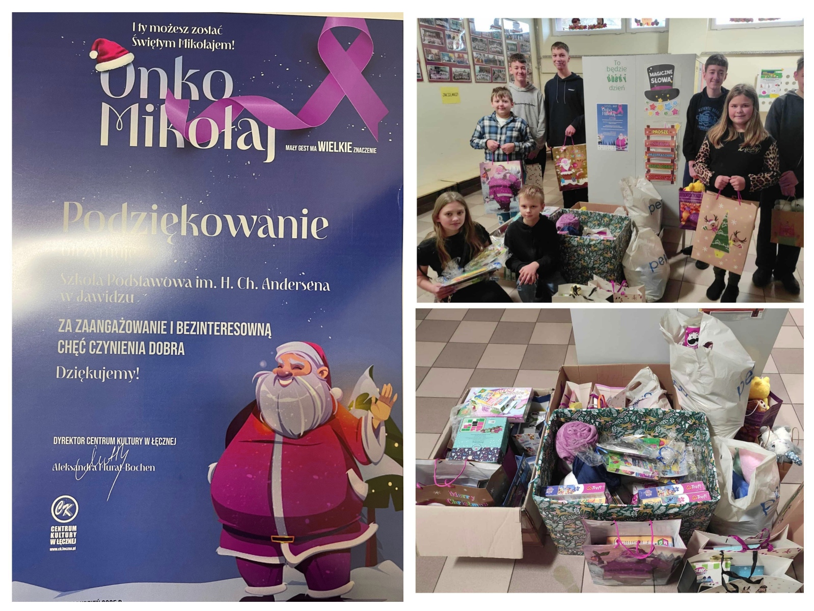 Z radością informujemy, że nasza szkoła włączyła się w akcję „ONKO Mikołaj”, której celem jest wsparcie dzieci przebywających na oddziałach onkologicznych. Dzięki ogromnemu zaangażowaniu uczniów, rodziców i nauczycieli przygotowaliśmy świąteczne paczki pełne dobroci i uśmiechu. Zostały one przekazane do Centrum Kultury w Łęcznej, skąd trafiły do małych pacjentów, niosąc im odrobinę magii i świątecznego ciepła.