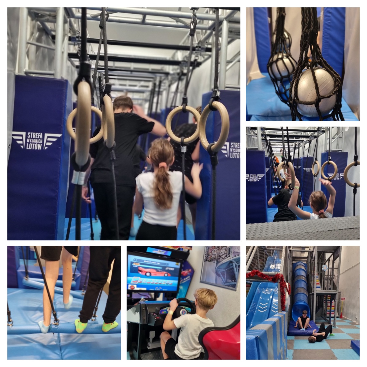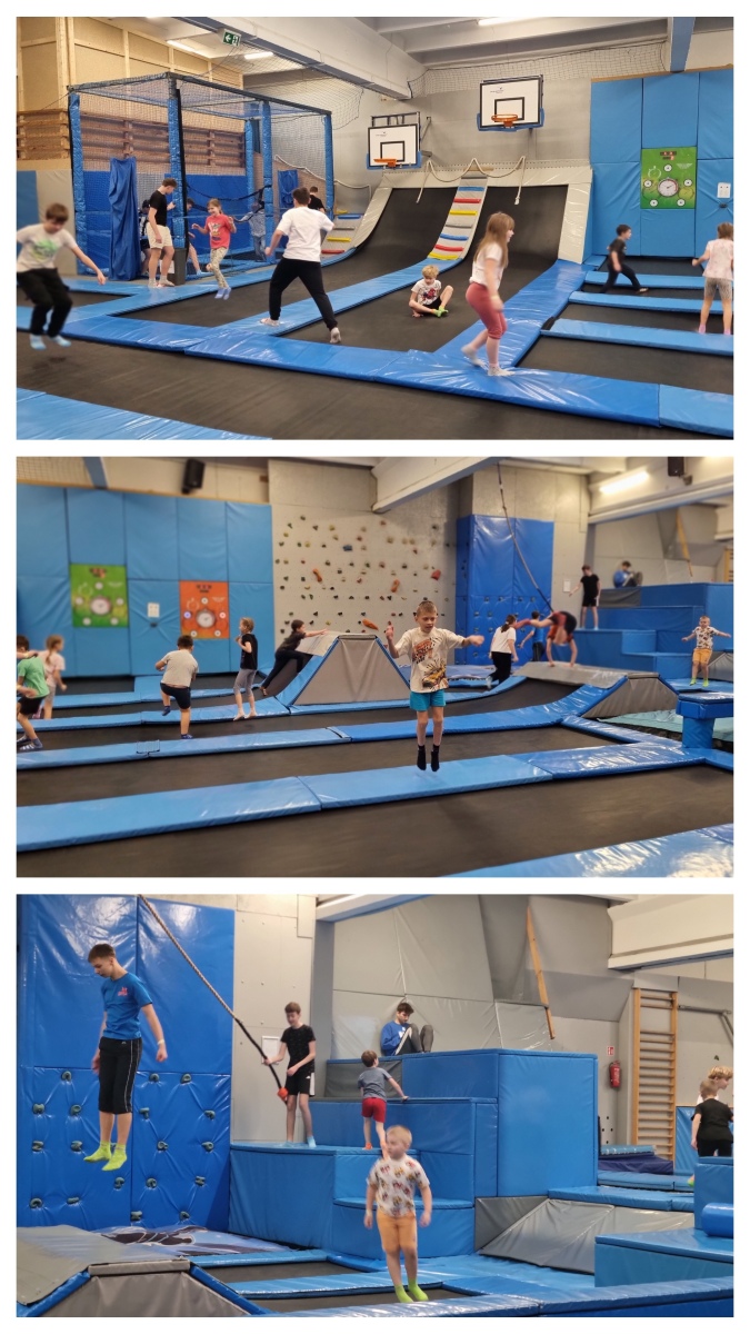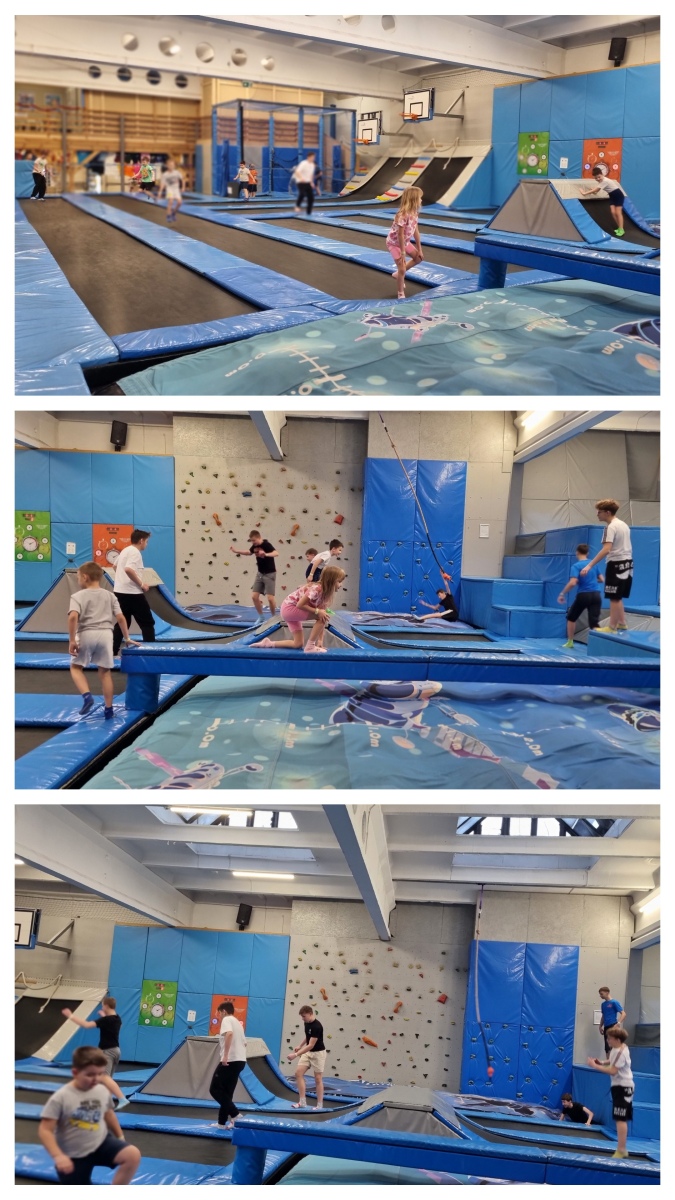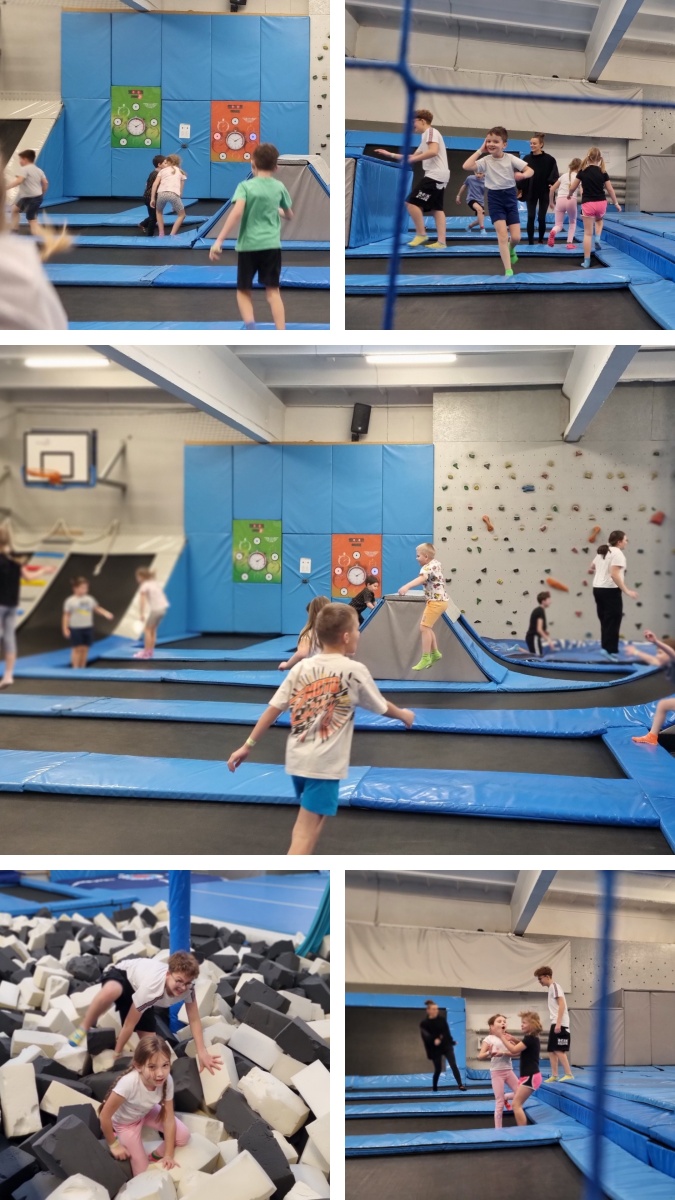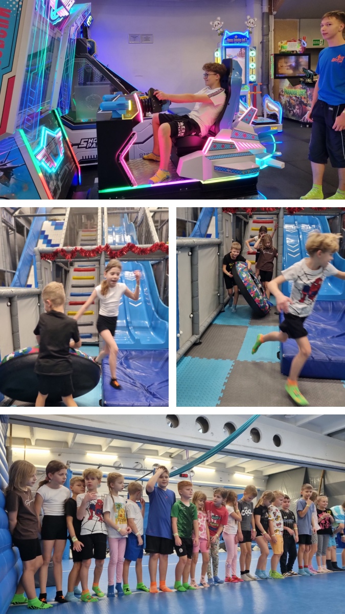 Nowy Rok rozpoczęliśmy od wyjątkowej wycieczki, która dostarczyła nam mnóstwa radości, ruchu i wartościowych doświadczeń. Pierwszym punktem programu była Strefa Wysokich Lotów – park sportowej rozrywki w regionie. To miejsce pełne energii i niezliczonych atrakcji, które łączą zabawę z aktywnością fizyczną. Czekały tam na nas dziesiątki trampolin, baseny z gąbkami, poduszki powietrzne, trampoliny sportowe, kosze do wsadów, ścianki wspinaczkowe, strefy akrobatyki sportowej i parkour, klatki ninja, ogromne dmuchane atrakcje, labirynty, zjeżdżalnie, tyrolki oraz wiele gier interaktywnych. Zabawie towarzyszyły także elementy edukacyjne – matematyka na sportowo, co sprawiło, że nauka stała się jeszcze ciekawsza.