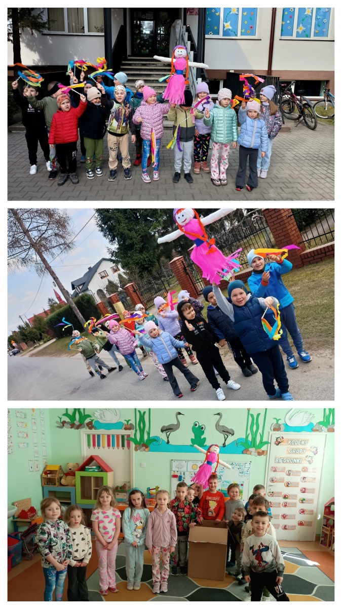Grupa „Biedroneczki”, która– aby wiosna już na stałe u nas zagościła – postanowiła wysłać Marzannę… kurierem za morze! Ten symboliczny gest wywołał wiele radości i śmiechu wśród dzieci, a jednocześnie był pięknym nawiązaniem do tradycji pożegnania zimy.